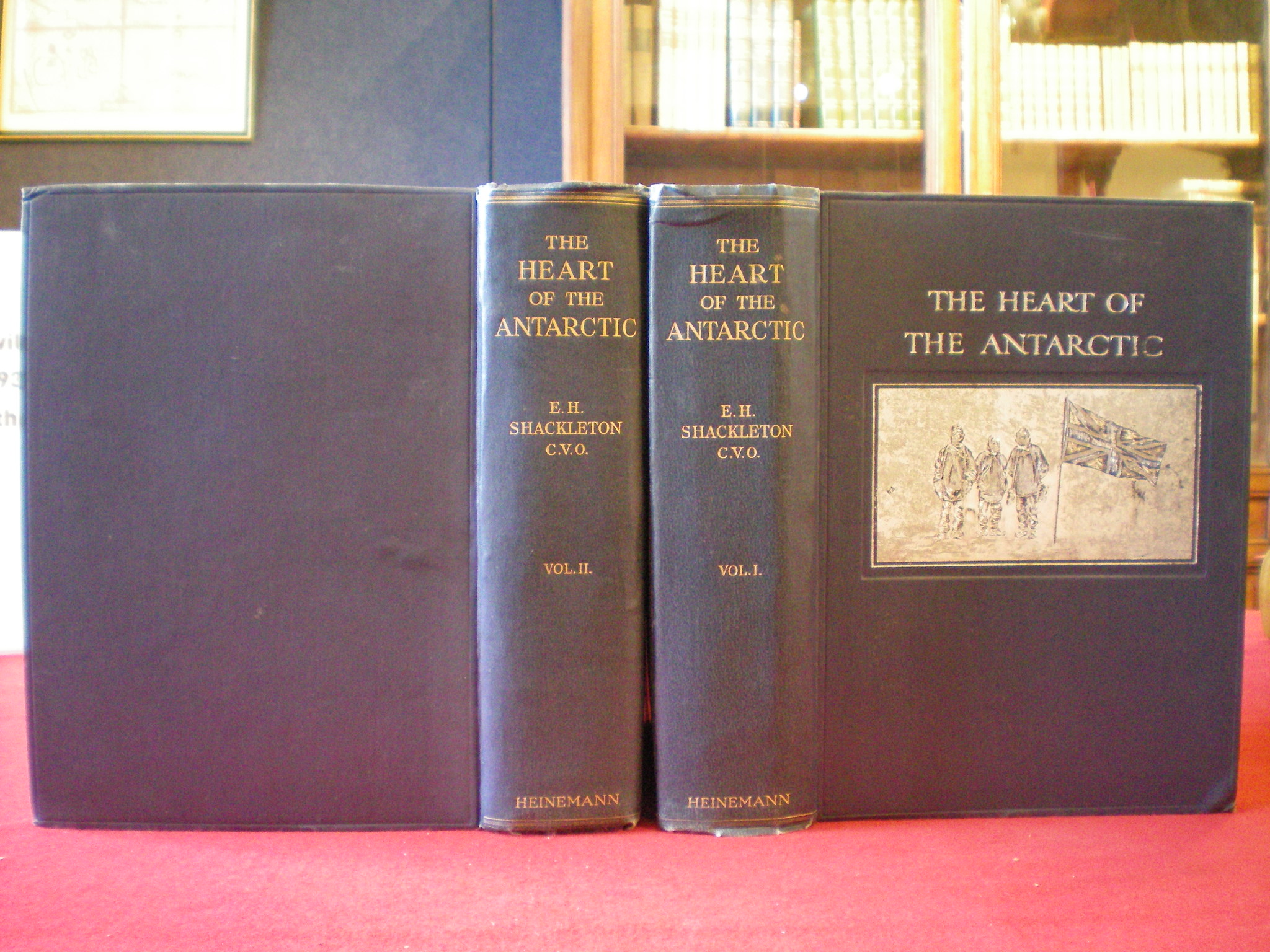 The heart of the Antarctic. London: William Heinemann, 1909. 8vo, 2 volumes, portrait frontispiece, 4 folding maps [in pocket at rear], plates, original blue cloth, silver panels to upper boards, fading to backstrips and sections of upper board of volume II (2)