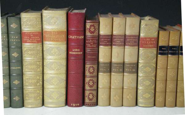 [Works]. New York, [n.d.], 5 volumes, 8vo, half calf gilt; Cromwell, O. Letters and speeches. 1846. Second edition, 3 volumes, 8vo, half calf gilt; Southey, R. The life of Nelson. 1916. 8vo, contemporary calf giltMahan, A.T. The influence of sea power upon history 1660-1783. 1890. 8vo, contemporary calf gilt; Jellicoe, Admiral The Grand Fleet 1914-16. 1919. 8vo, contemporary calf gilt; Rosebery, Lord Chatham. 1910. 8vo, red morocco gilt; Brantome, Sieur de Famous women. 1908. 8vo, red morocco gilt by Riviere; Gerard, F. Some celebrated Irish beauties. 1895. 8vo, red morocco gilt; Austin, A. In Veronica's garden, 1900; Lamia's winter quarters, 1898; The garden that I love, 1899, uniform brown half morocco gilt by Sotherans; and 12 others (29)