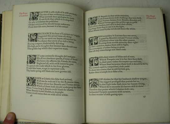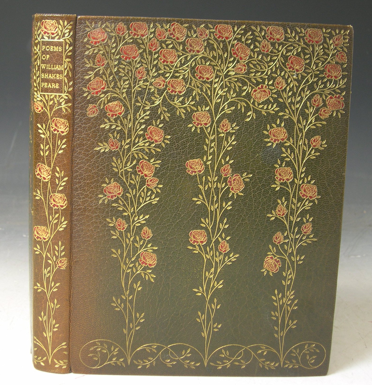 The poems. Essex House Press, December 1899. Number 266 of 450 copies, printed in red and black, woodcut initials, green morocco by Sotherans, spine and covers with onlay of red roses and gilt stems, vellum endpapers, morocco doubloures, t.e.g., others uncut, somewhat discoloured