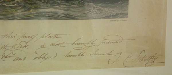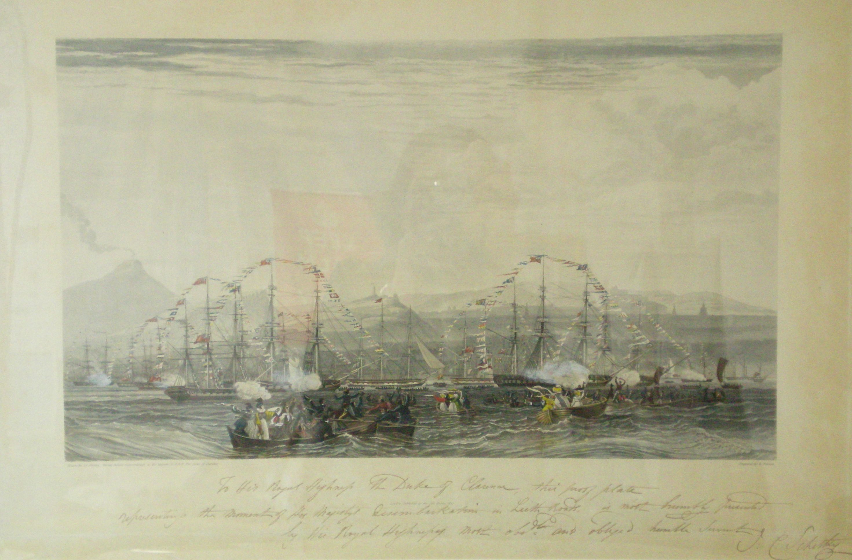 [The arrival of King George IV at Leith Docks, 14 August 1822]. London, 1823. Hand coloured aquatint [proof plate], presentation inscription from the artist to the H.R.H. Duke of Clarence [future King William IV], approx. 42 by 61cm, framed and glazed, fading