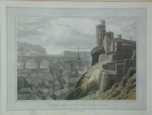 Broughty Castle; Edinburgh; Leith; Loch Duich; Montrose; Dunstaffnage Castle; From the Isle of Rasay looking westward; Distant view of Edinburgh; Loch Scarig, Skye; Entrance to the cave of Snowe. London, c.1820. 10 hand coloured aquatints, approx. 23 by 30cm., framed and glazed (10)