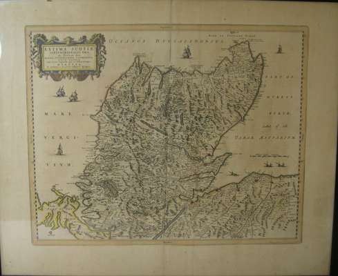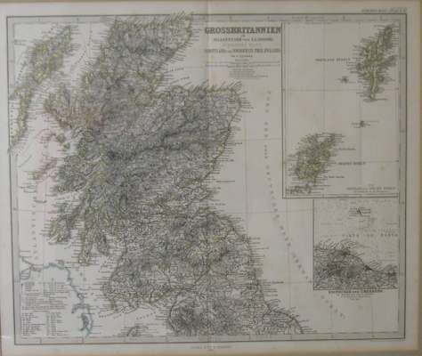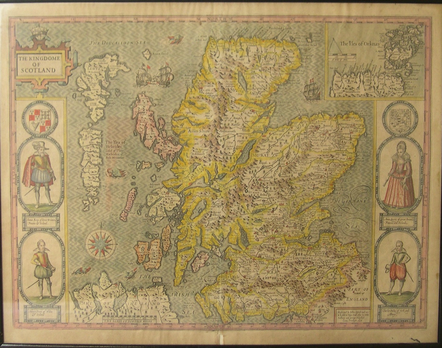 The kingdome of Scotland. London: John Sudbury and George Humbell, 1610. Engraved map, borders with King James I and other royal personages, hand-coloured in outline, text on verso, centre fold strengthened on verso, double glazed, slightly browned, slight loss at fold in lower margin, repaired on verso; Blaeu, Jan Extima Scotiae septentrionalis ora. Double-page engraved map, hand-coloured in outline, 52.5 by 64.5cm., Spanish text on verso, 11cm. split at centre fold, repaired on verso, double glazed; Petermann, A. Grossbrittanien. Gotha, 1869, map of Scotland [from Stieler's Hand-Atlas], 35 by 42cm., framed and glazed (3)