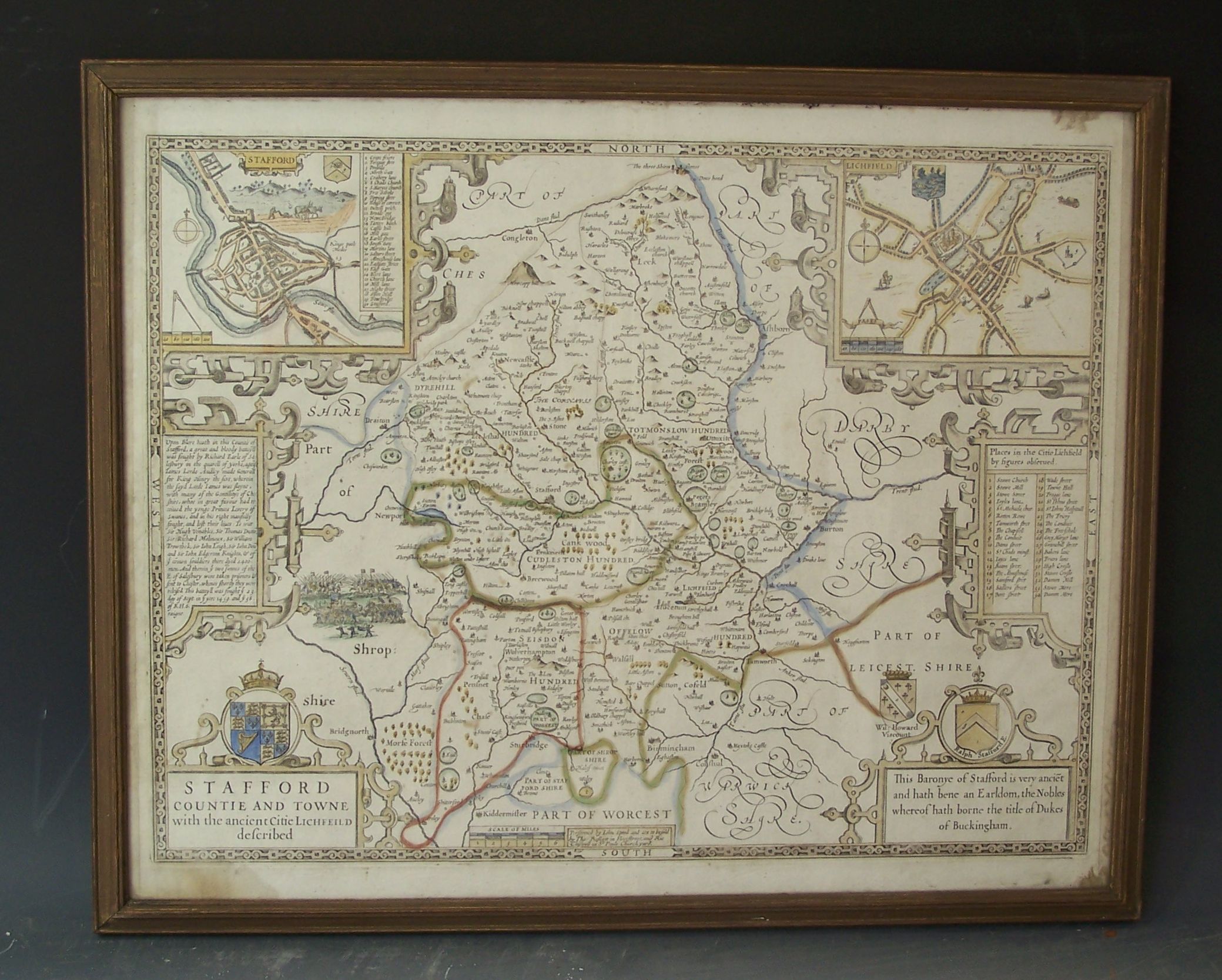Stafford countie and town. London: Thomas Bassett and Ric. Chiswell, [1676]. 42 by 52cm., hand-coloured engraved map, inset view of Stafford and Lichfield, left and right margins slightly trimmed, slight dampstain in lower left corner, framed and glazed; [Idem] The countie of Nottingham. London: John Sudbury and George Humble, 1611. 42 by 53.5cm., hand-coloured engraved map, inset view of Nottingham, framed and glazed; [Idem] Wilshire. London: Thomas Bassett and Richard Chiswell, [1676, or later]. 40.6 by 53cm., engraved map, inset view of Salisbury, double glazed, strengthened at centre fold on verso, some discolouration along centre fold (3)