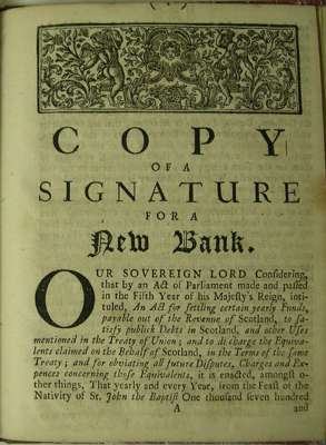 Act of Parliament for erecting a bank in Scotland. Edinburgh, July 17, 1695. 8pp., [Wing S1128]; [Royal Bank of Scotland] Copy of a signature for a new bank. [Edinburgh ?, 1727]. 35pp., a few page numerals shaved, 2 works bound in one, modern calf-backed marbled boards