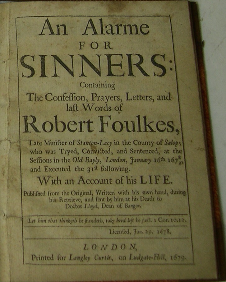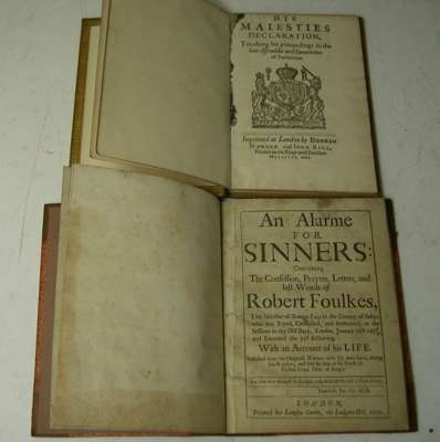 His Maiesties declaration, touching his proceedings in the late assemblie and convention of Parliament. London: Bonham Norton & John Bill, 1621. 4to, [2], 63, woodcut arms on title, title slightly stained in inner margin and strengthened on verso, nineteenth century calf gilt, [STC 9241], upper board detached; [Foulkes, Robert] An alarme for sinners: containing the confession, prayers, letters and last words of Robert Foulkes. London: Langley Curtis, 1679. 4to, [4], 39, nineteenth-century half calf, gilt, title slightly dust-soiled and with two short tears, [no loss], [WIng F1644] (2)