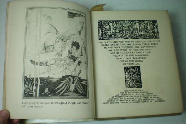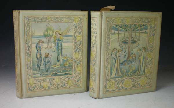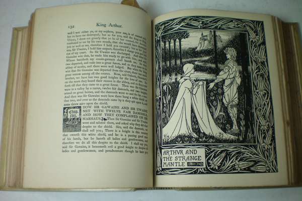 Le morte Darthur. London: J.M. Dent, 1893-94. 8vo, 2 volumes, one of 1500 copies, illustrated by Aubrey Beardsley, frontispieces, contemporary painted vellum gilt by Chivers, t.e.g., marble endpapers, some slight spotting to page edges