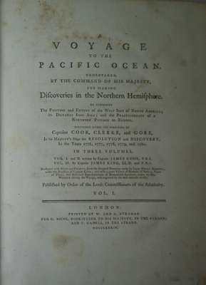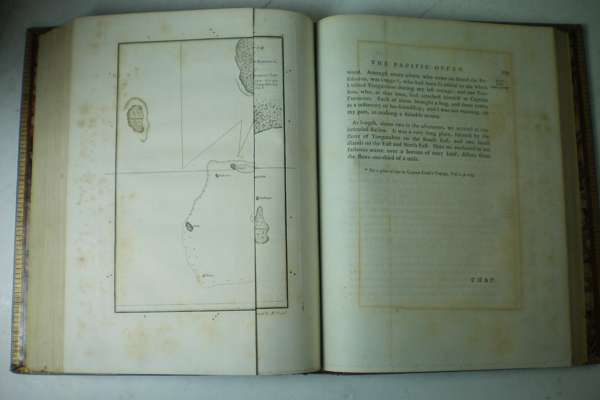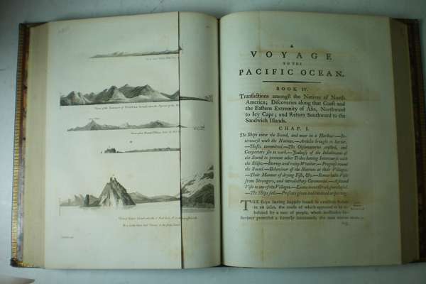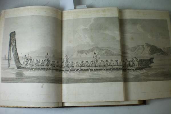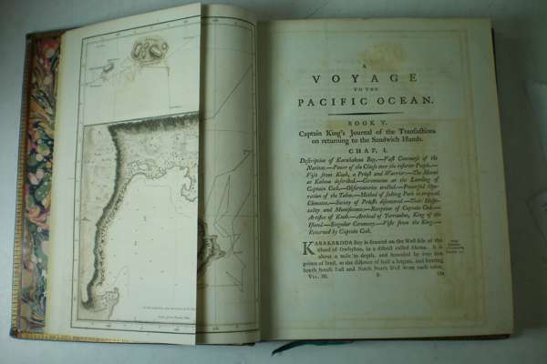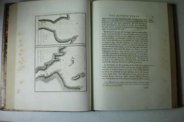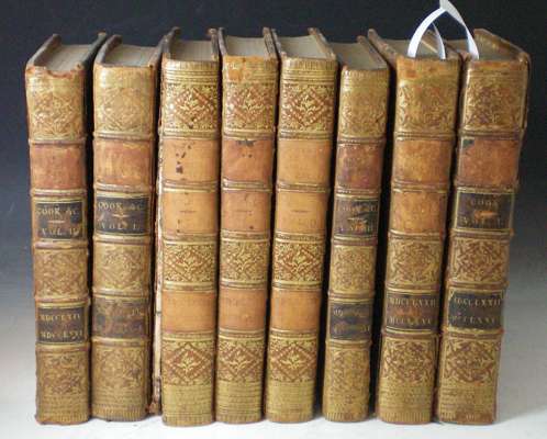 An account of the voyages undertaken by the order of His present Majesty for making discoveries in the southern hemisphere. London: W. Strahan & T. Cadell, 1773. First edition, 3 volumes, 4to, 52 charts and plates, some folding, margin of plate 6 volume 2 repaired, rather spotted, some offsetting; A voyage towards the South Pole. London: W. Strahan & T. Cadell, 1777. Second edition, engraved portrait offset onto title and 63 plates, charts and maps, plates somewhat spotted and discoloured, offsetting from plates, a few plates cropped, marginal tear to plate p. 184 volume 2; Cook, J. & Capt. King A voyage to the Pacific Ocean. London: W. and A. Strahan, 1784. First edition, 3 volumes, 4to, lacking the folio atlas, 23 (of 24) engraved plates (lacking plate 23 of volume 1), tear to d1 volume 1 repaired, a few paper flaws, occasional finger soiling, paper flaw to H2, M4 volume 1 & several other leaves, spotting and offsetting, contemporary diced russia, worn, joints split, several covers detached, corners rubbed, lacking most lettering pieces (8)