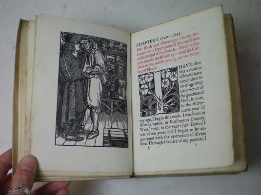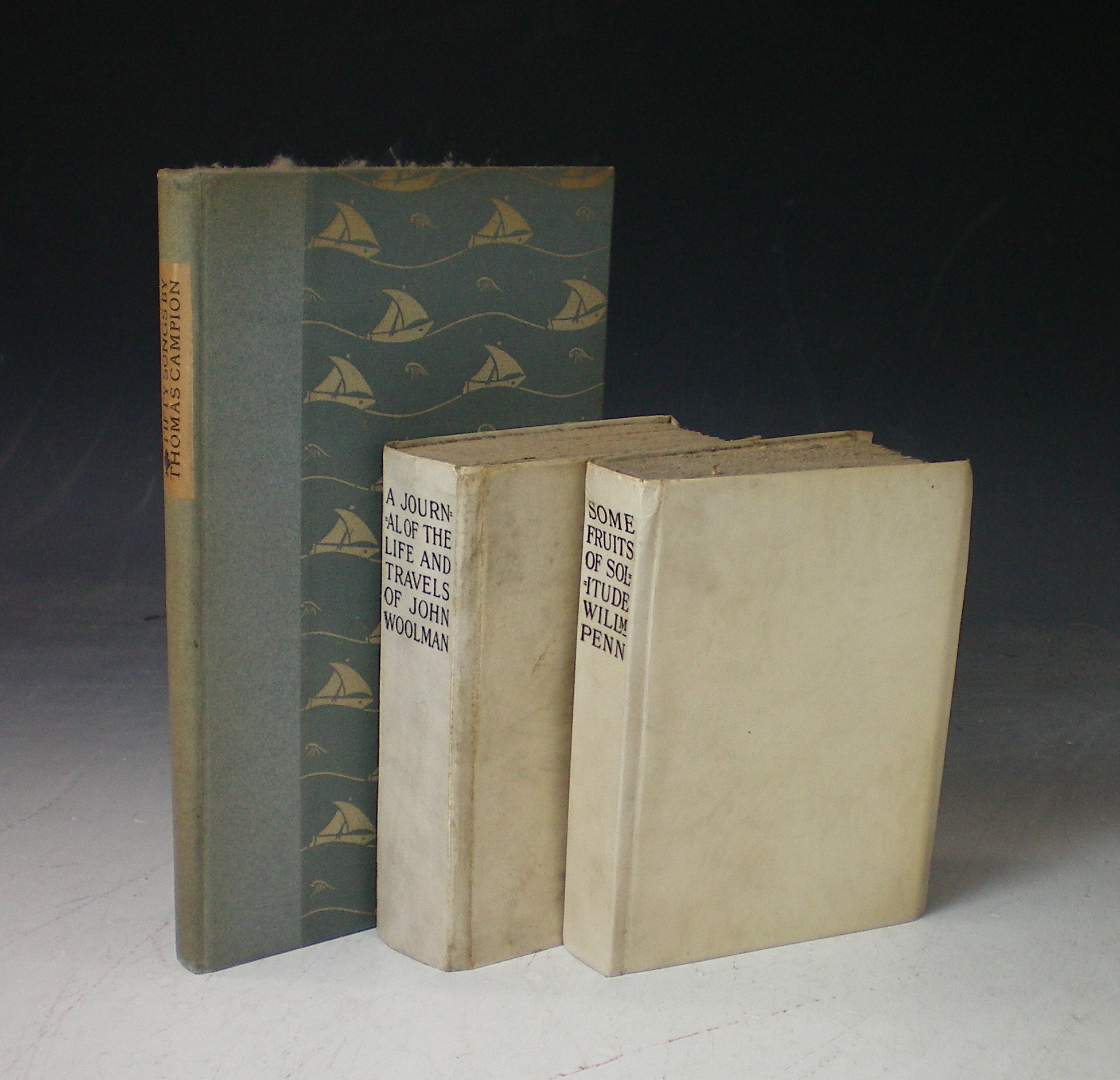 A journal of the life and travels of John Woolman. London: Essex House Press, 1901. 16mo, one of 250 copies, original vellum, uncut; Penn, William Some fruits of solitude. London: Essex House Press, 1901. 16mo, number 240 of 250 copies, original vellum; Campion, Thomas Fifty songs. London: Ballantyne Press, 1896. 8vo, designed by Charles Ricketts, original decorative boards, some fading to backstrip (3)
