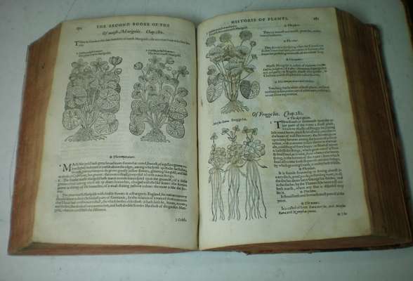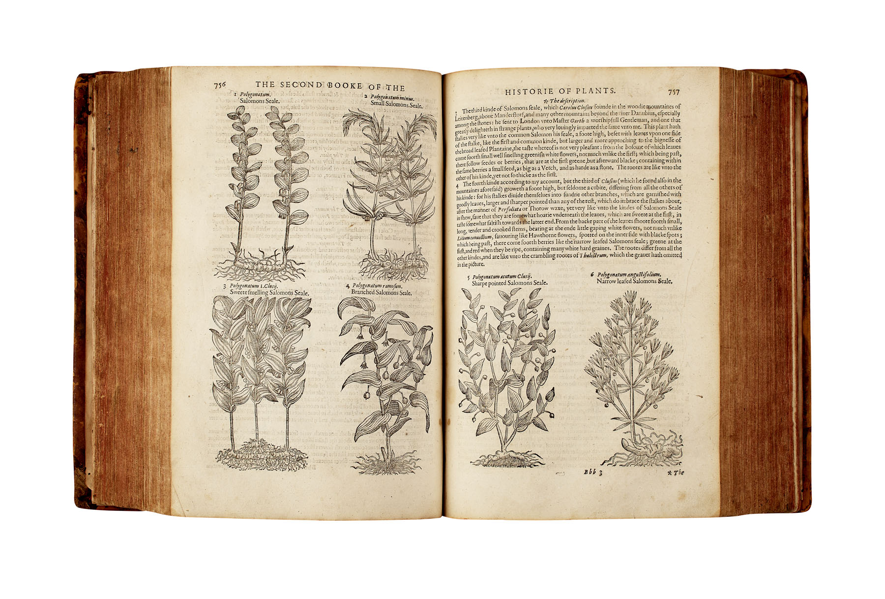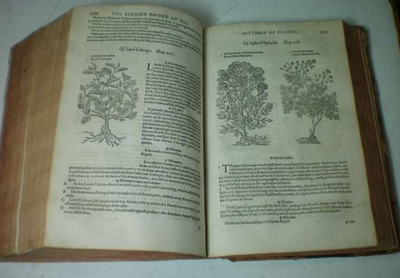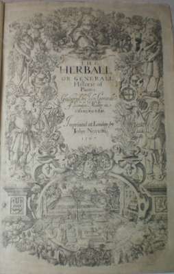 The herball or generall historie of plantes. London: John Norton, 1597. Folio, lacking portrait, engraved title, later calf, worn, upper board loose, lacking labels, later endpapers, some pages repaired at edges including the title page, bookplate