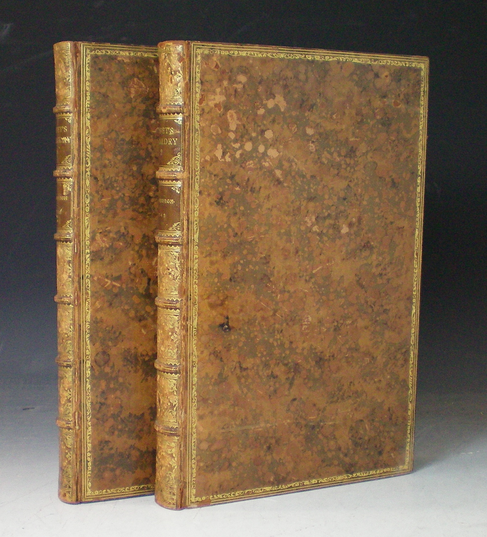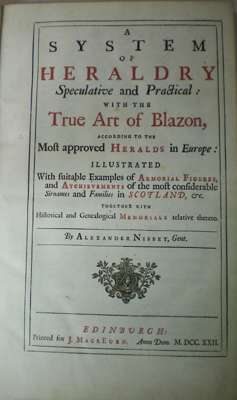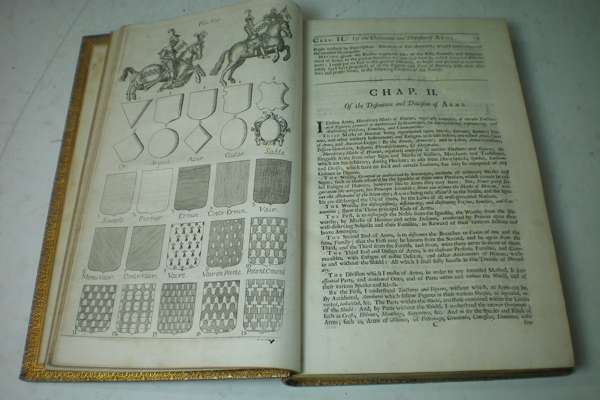A system of heraldry, speculative and practical. Edinburgh: J. Mackeuen, 1722-42. Folio, 2 volumes, titles printed in red and black, 51 engraved plates, 19th century calf gilt, a.e.g., brown morocco lettering pieces, joints slightly cracked