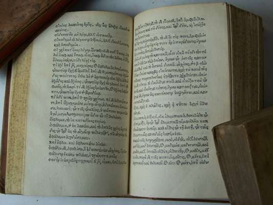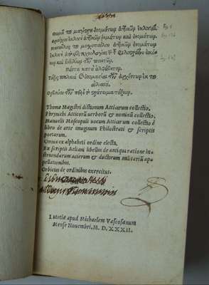 Thomas Magistri dictionum Atticarum collectio. Phrynichi Atticorum verborum & nominum collectio. Manuel Moscopuli vocum Atticarum collectio e libro de arte imaginum Philostrati & scriptis poetarum. Paris: apud Michaelem Vascosanum, 1532. 8vo, eighteenth century calf, [Adams T 647], worn, manuscript page numerals in extreme upper corner, small early manuscript deletions to title-page