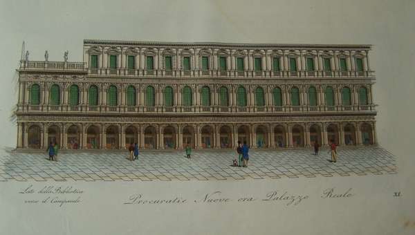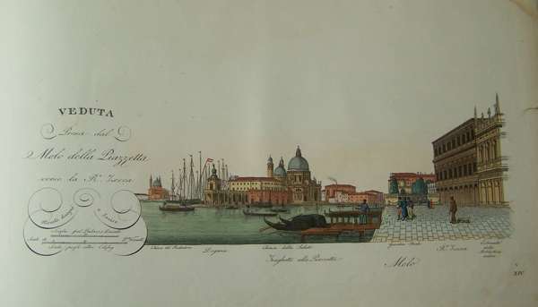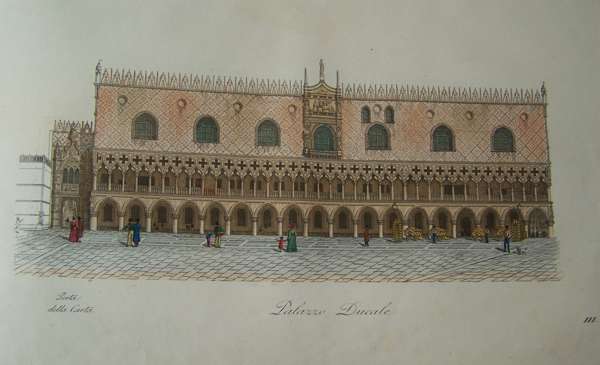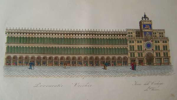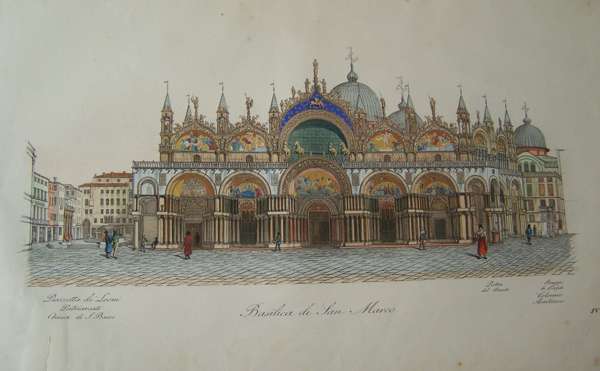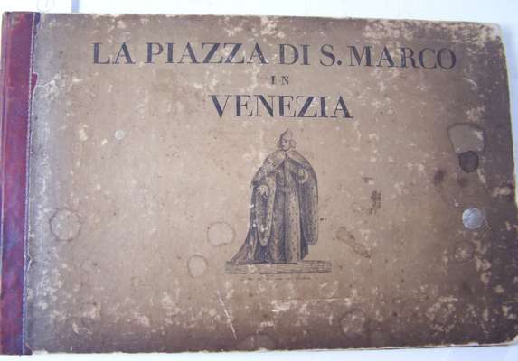 La piazza di San Marco in Venezia considerata come monumento d'arte e di storia. Venice: Tipografia di Commercio, 1831. Oblong folio, additional title with hand-coloured vignette, 16 hand-coloured engraved plates, some plates heightened with gold, original roan-backed pictorial boards, two plates with repaired tear not affecting image, some slight spotting in margins, several plates with small stain in extreme corner and slightly frayed or soiled in the margin, some text leaves and two plates with light dampstain, boards rubbed and spotted, upper hinge broken