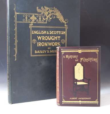 English and Scottish wrought ironwork. Edinburgh: George Waterston & Sons, 1904. Folio, 80 plates, original cloth gilt, some rubbing to edges, foxing to endpapers but remaining interior clean; Jacquemart, Albert A history of furniture. London, [no date]. 8vo, frontispiece, plates, original decorative cloth gilt, fading to backstrip; Twopeny, William English metal work. London, 1904. 4to, half title, 93 plates, original green cloth gilt; Landor, A. Henry Savage In the forbidden land, an account of a journey in Tibet. London: William Heinemann, 1898. 2 volumes, 8vo, frontispiece, folding map, plates, original decorative green cloth gilt, backstrips faded and rubbed, first few leaves of volume II stained with red ink at edges (5)