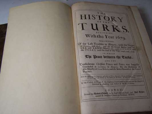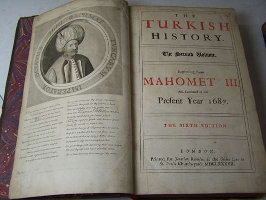The history of the Turks, beginning with the year 1679. London: printed for Robert Clavell, 1700. First edition, folio, 6 portraits, contemporary calf , worn, rebacked, upper board loose, some staining; [Idem] The Turkish history. London: Jonathan Robinson, 1687. Sixth edition, folio, volume 2 only, 3 portraits, [bound with] The history of the Turkish empire from the year 1623 to the year 1677. London: printed for Thomas Basset, et al, 1687. Folio, portrait frontispiece, 2 portraits, [bound with] The present state of the Ottoman empire. London, 1687. Folio, contemporary calf uniform with previous, worn, rebacked (2)