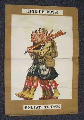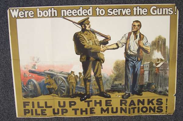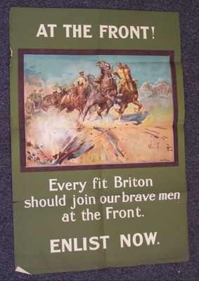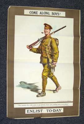 Women of Britain say "Go!". PRC number 75, c.1915. Approx. 75 by 50cm, previous folds, some short tears to edges; Edwards, Lionel At the front! Every fit Briton should join our brave men at the front. PRC number 84, c. 19??. Approx. 76 by 51 cm, previous folds, some short tears to edges; Caffyn, W. H. Come along, boys! Enlist to-day. PRC number 22, 1915. Approx. 76 by 51 cm, previous folds, small tears to margin; [Anon.] Line up, boys! Enlist to-day. PRC number 54, 1915. Approx. 76 by 51 cm, previous folds, tears to edges; [Anon.] We're both needed to serve the guns! Fill up the ranks! Pile up the munitions! PRC number 85c, c. 1915. Approx. 75 by 51cm, previous folds, some tears to edges and another copy the same (6)
