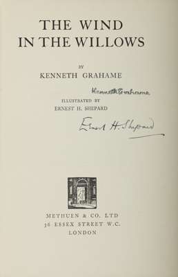 The wind in the willows. London: Methuen & Co., 1931. First edition illustrated by E.H. Shepard, signed on the title by Grahame and Shepard, original green cloth gilt, some slight rubbing to head and tail of backstrip, interior clean