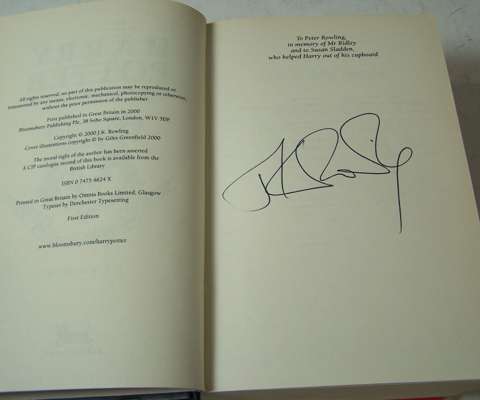 Harry Potter and the goblet of fire. London: Bloomsbury, 2000. First edition, 8vo, signed by J.K. Rowling on the dedication leaf, original cloth, dust-jacket