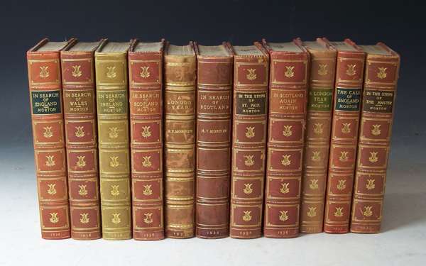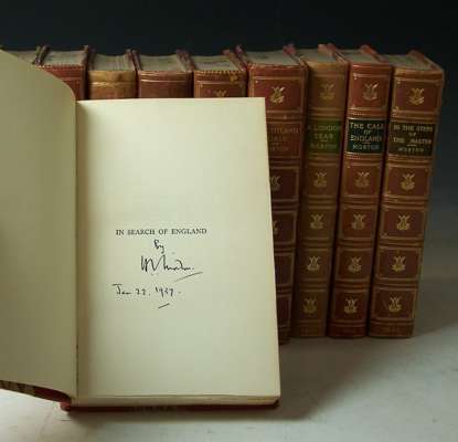 A collection of 11 signed copies, to include In the steps of St. Paul, 1936. First edition; In Scotland again, 1936; A London year, 1933; The call of England, 1935; In the steps of the master, 1935; In search of Wales, 1936; In search of England, 1936; In search of Ireland, 1936; In search of Scotland, 1936; A London year, 1933; In search of Scotland, 1933 [special presentation copy from Methuen & Co. to C.W. Chamberlain]; all bound in half calf gilt by Bayntun of Bath, some fading to backstrips (11)