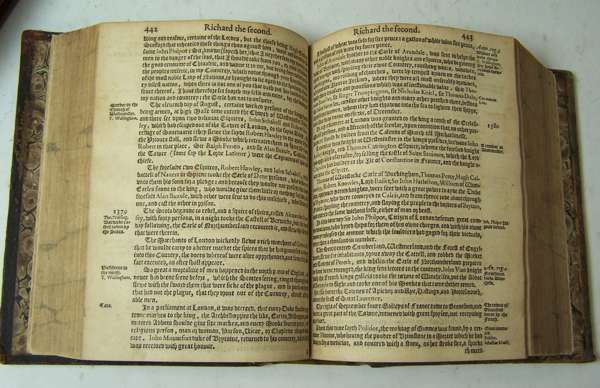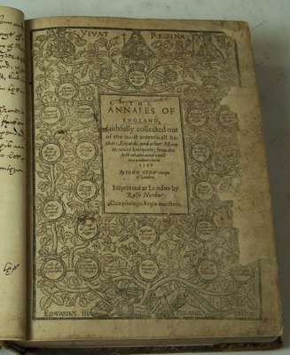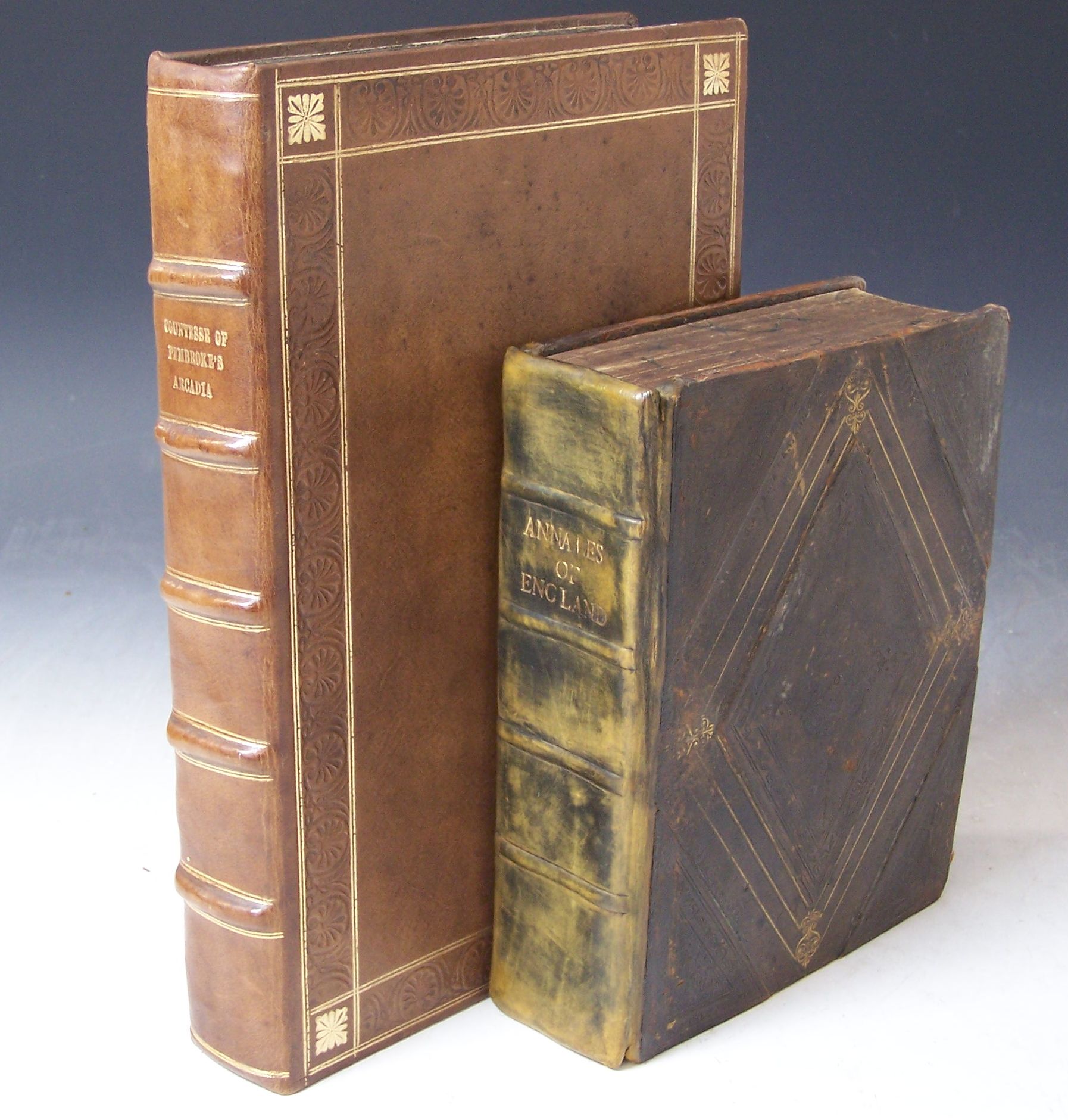 The annales of England. London: Ralfe Newbery, 1592. 8vo, title within woodcut border, nineteenth century blindstamped calf, lacking A1, initial cut from I2, O8, T5, Y5, FF1 [& possibly other leaves], final leaf 4Q5 with slight loss, title worn with some loss, rebacked, soundly bound Sidney, Sir Philip [The countess of Pembrokes Arcadia] [London: Simon Waterson, 1628]. Folio, modern panelled calf, [STC 22547], lacking title page, A2 torn without loss, slight dampstaining to second half (2)