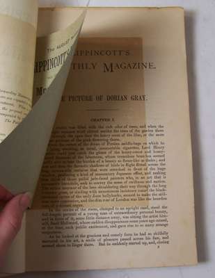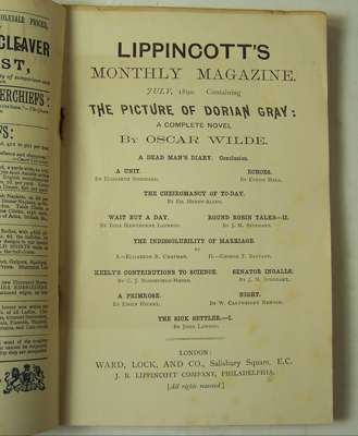 The picture of Dorian Gray [in] Lippincott's monthly magazine, No 271. London: Ward, Lock & Co., July 1890. 8vo, advertisements, original printed wrappers, covers browned, covers chipped at edges, three holes to upper cover [one going through to third leaf] affecting main title text and adverts, hinges and backstrip splitting, offsetting from insert to pp.3, foxing