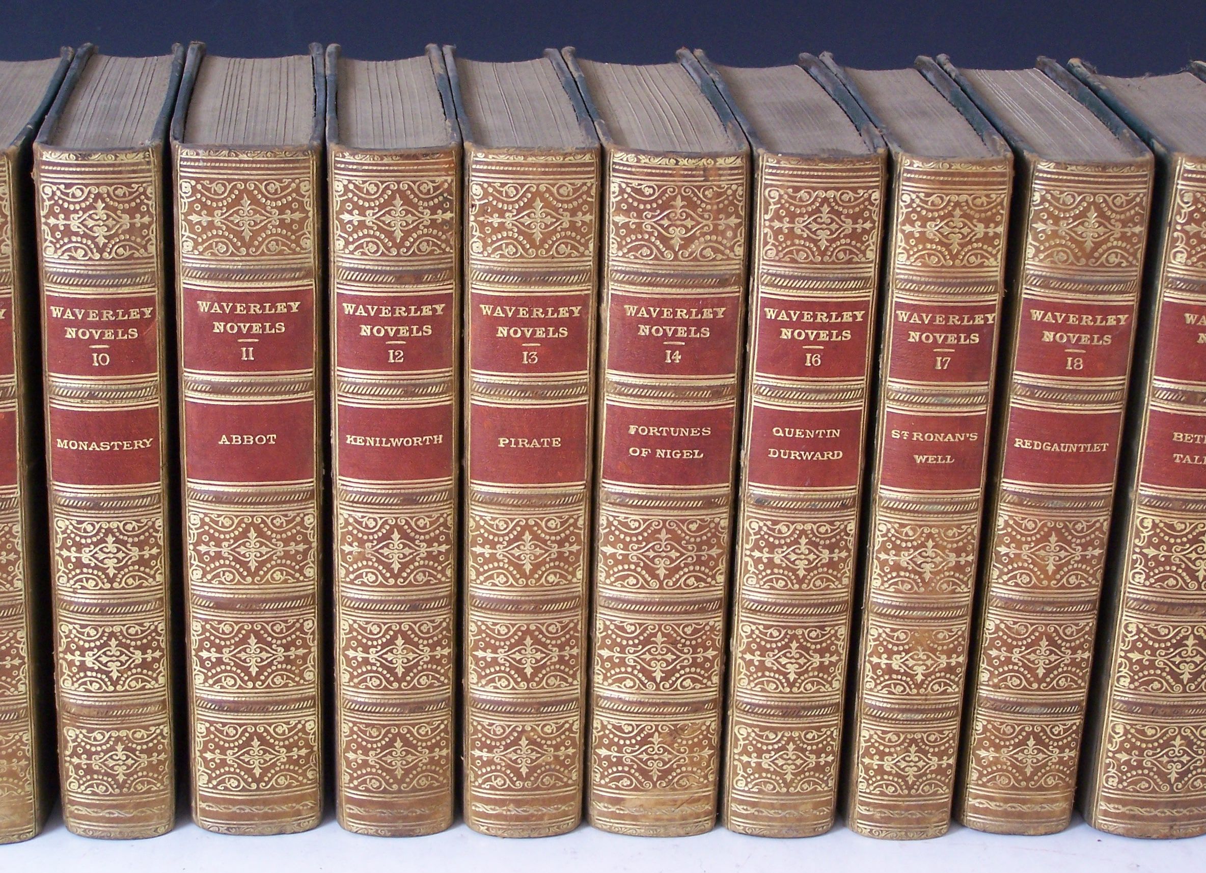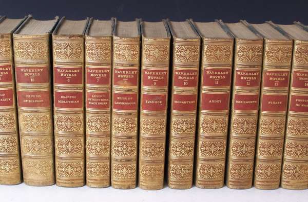 Waverley Novels. London: J.C. Nimmo, 1898-1901. 24 volumes, Large Type Border Edition, plates, half calf, spines gilt, morocco labels, spines uniformly faded