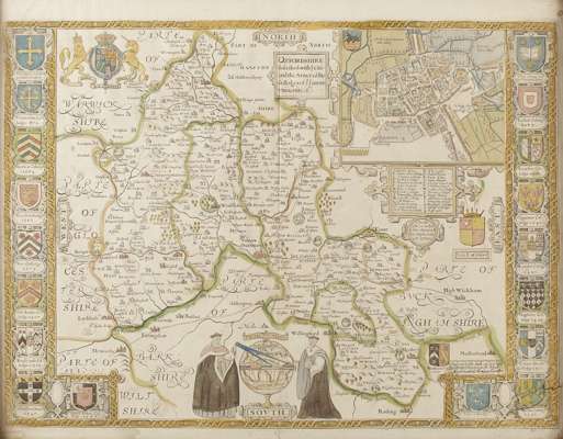 Oxfordshire. London: Henry Overton, [c.1707]. Hand-coloured engraved map, 420 x 532mm., inset view of Oxford, bordered with College coats-of-arms, light dampstain in bottom left corner, framed and glazed