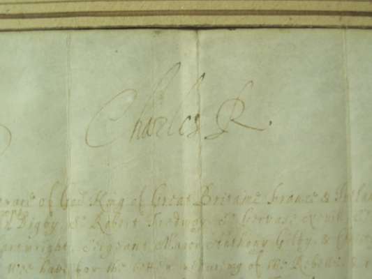 Original commission, on vellum, signed at head by King Charles I ("Charles R."), appointing Sir Richard Willis Knt., Governor of Newark, Robert Lord Lexonton, Sr. Gervase Clifton Knight & Baronett, Sir Gervase Scroope & others as commissioners "to hear, judge & determyne all... disputes that may or shall arise between Countrymen & Souldiers and in case of plundering, robbery, or any other violence to cause restitution to bee made, & if the offence... shall deserve corporall punishment that you represent it to the Governor who is to give order to have it speedily tryed at a Court of warr & punished accordingly" 22 lines, 380 x 215mm., 12 October, 1645, counter-signed lower right E.D.W. Walker, with note dated 21 March 1773 on the verso by Thomas Percy, stating that under this commission his great grandfather's brother, John Clieveland Esq., the celebrated poet, acted as Judge-Advocate in Newark while it was garrisoned for the King, framed and glazed, somewhat faded but entirely legible