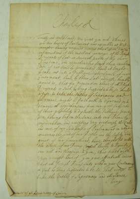 Order in a secretarial hand to the Commissioners of the Lieutenancy of the City of London "that all Popish Recusants within your Lieutenancy or such as being suspected to be so... be forthwith so disarmed...", 30 by 19cm, signed by King Charles II at head, 24th November 1666