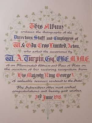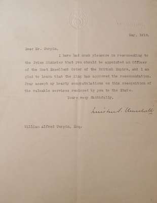 Letter signed to W.A. Turpin, informing him that he has been appointed OBE, 1 page, 4to, Whitehall, May 1918, together with a document signed by Edward, Duke of Windsor, as Prince of Wales, appointing Turpin OBE, June 1918, both loosely inserted with other related documents, photographs, and press cuttings, inside a testimonial album signed by Directors, Staff, and Employees of W. & E. du Cros Ltd., congratulating Turpin on his award, 31 pages, folio, June 1918