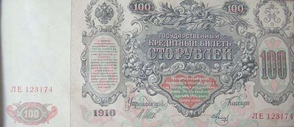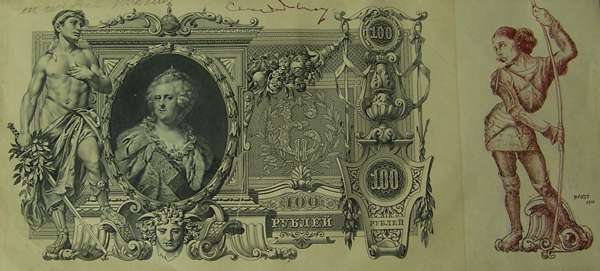 Russian bank note. c. 1911, signed by Debussy at upper edge, mounted, previous framed and glazed, inscription on mount relating to Colette Willi, accompanied by a letter from the manager of the Royal Opera Covent Garden