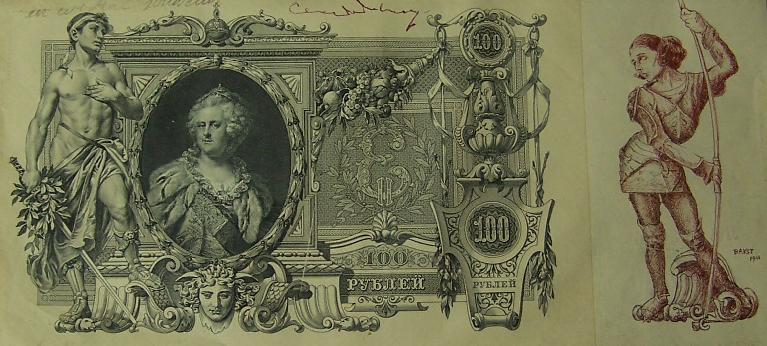 Note: It is thought that this bank note was made in payment for a wager between Debussy and Fokine regarding the music for the 1911 opening in Paris of Le Martyre de Saint Sebastien. It was then, in turn, presented to Madame Colette Willi who then presented it to the British Red Cross.