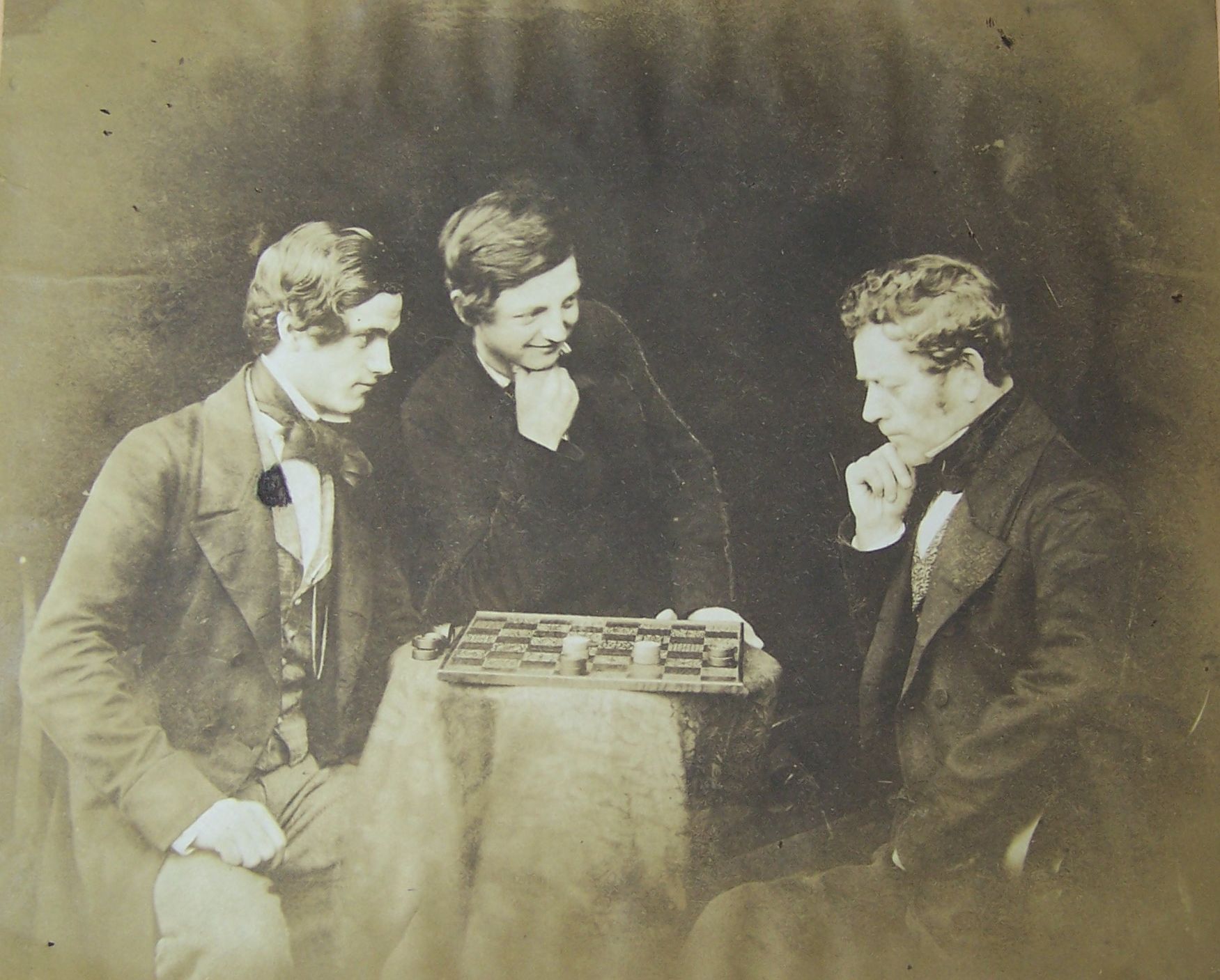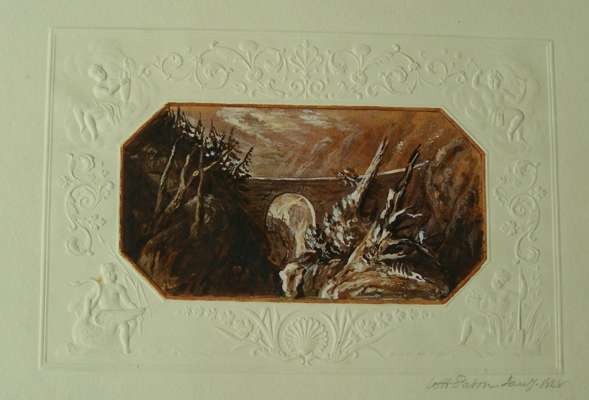 A commonplace album containing a collection of small watercolours, manuscript poems and two early photographs, including two small watercolours signed Waller Hugh Paton, 1848; small pencil sketch initialed by Waller Hugh Paton, 1845; manuscript poem entitled "Dirge" signed by John Noel Paton, 1848; a small ink sketch signed by Waller Hugh Paton, 1845; three salt print photographic portraits, c.1840's-50's, of Sir David Brewster [18 by 14cm], Sheriff Gordon [18 by 14cm], a group playing chequers [15 by 19cm] and a small uncaptioned portrait [6.5 by 8cm], print of chequer players stuck down onto card leaf, others loose in album, bound in contemporary green morocco, lacking backstrip, upper board loose