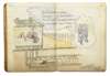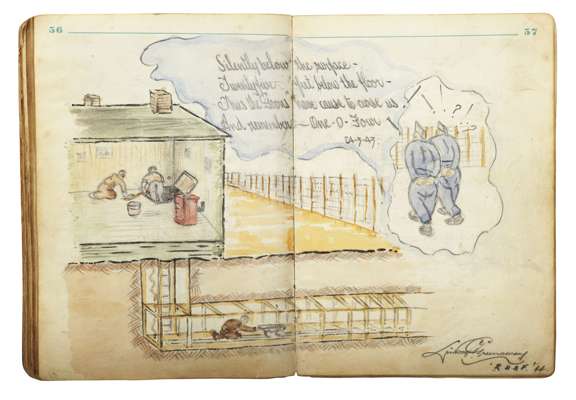 Wartime log belonging to Pte. William Macdonald from his time in the German prisoner of war camp Stalag Luft III, dated 1944 - 1945, containing several pages of verses, 15 pages of names and home addresses of other prisoners, 25 tipped in photographs, including one of the Stalag VIIIB school tutors, 5 of life in the camp including the cobblers, 28 drawings in pencil and watercolour by various other P.O.W.'s, including F. Perkins, Jas. T. R. Taylor, G.R. "Chips" Carpenter, Flight Lt. A. Cassie, R. Trunole, A.P. Culverwell, Lt. D.A. Woods U.S.A.A.F, Lindsay Grafton Greenaway R.A.A.F, Flight Lt. P.Hood, A. G. Turton, drawings a mixture of comical scenes of camp life, a view of the camp theatre, a double page watercolour showing the famous "Harry " tunnel from Hut 104, a pencil sketch of the D-Day landings, a single sketch of Milag Nord [Merchant Navy camp] and saucy postcard scenes, original cloth, tape repairs to backstrip, a few leaves loose