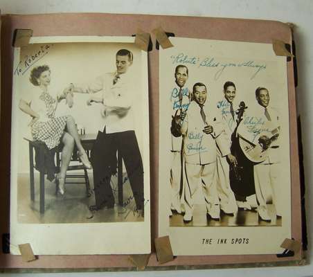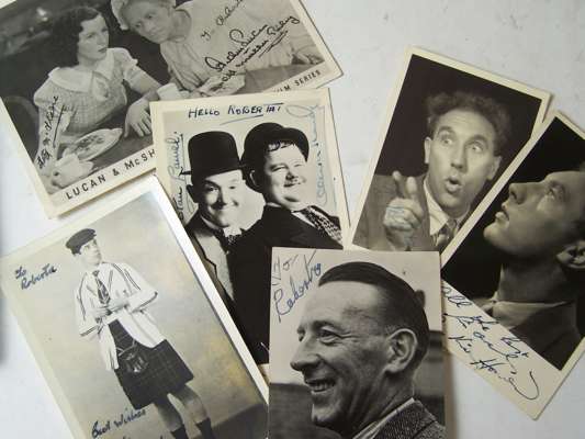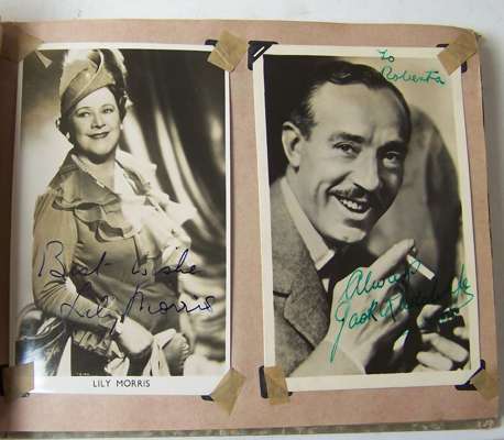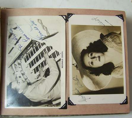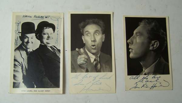 A album of 90 signed photographs of various theatre and film stars, including Stan Laurel & Oliver Hardy, Frankie Howard (2), Wilfred Pickles, Martha Raye, Robert Wilson, Charlie Chester (2), Donald Peers, Jack Ratcliffe, Elaine Carol, Sara Gregory, The Ink Spots, Charles Shadwell, Reginald Dixon, all photos held in with corners, contemporary album, original silver boards