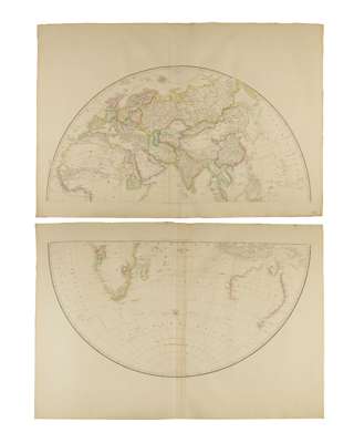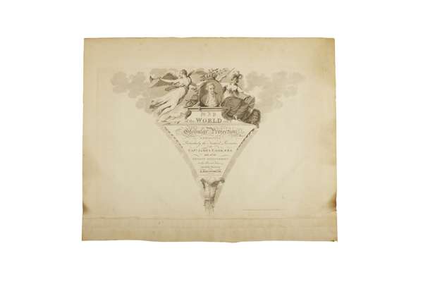 Map of the world on a globular projection exhibiting particularly the nautical discoveries of Capt. James Cook. London, 1794. Engraved title and dedication, and 4 double-page sheets, each approx.100 x 67cm., hand coloured in outline, strengthened at folds on verso, slight vertical discolouration at centre to sheets from guards