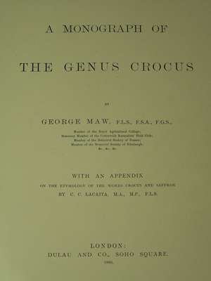 A fine, clean copy. George Maw dedicated his book Monograph of the genus Crocus (London, 1886) to Mr and Mrs Charles Danford, whose journeys he states "throughout the length and breadth of Asia Minor in the years 1876, 1878 and 1879, added much to the knowledge of Crocuses in that district. Many of the Vignettes appearing in the present book have been engraved from original sketches made by Mr Danford in the remote mountain region of the Taurus and other parts of Asia Minor, and to Mrs Danford I am indebted for the roots of several new species of Crocus discovered by her, and also for much valuable information respecting the habitats of Crocuses throughout Asia Minor." Crocus Danfordiae is illustrated on plate 63 and was discovered by Mrs Danford in 1879.
