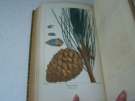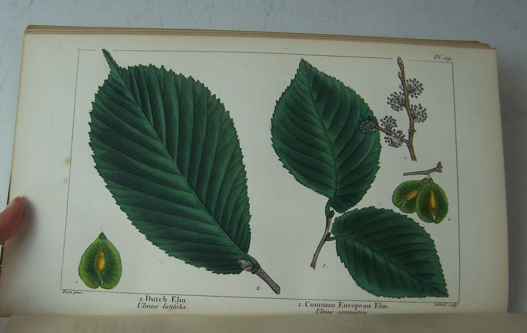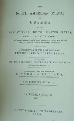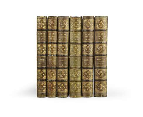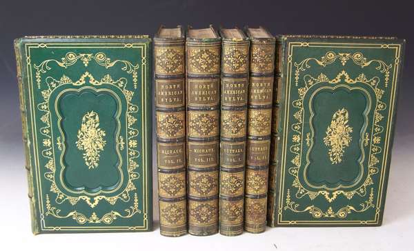 The North American sylva. Philadelphia: Robert P. Smith, 1855. 8vo, 6 volumes (including Nuttall's 3-volume supplement), 276 [of 277] hand-coloured engraved plates after P.J. and H.J. Redouté, Bessa, and others, contemporary green morocco gilt, the covers inset with a floral motif surrounded by foliate borders gilt, gilt spines, turn-ins and edges, the supplement lacking plate 65 in volume 2, volume 1 upper cover detached (6)