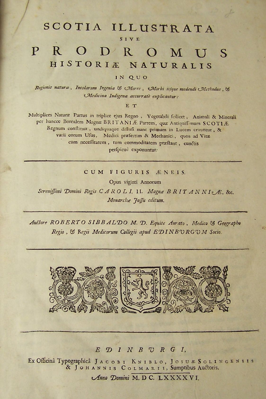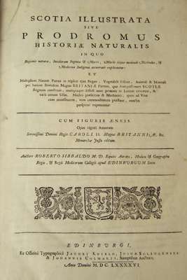 Scotia illustrata sive prodromus historiae naturalis. Edinburgh: Jacobi Kniblo, Josuae Solingensis & Johannis Colmarii, 1696-1684. Folio, 3 parts in one volume, 22 numbered engraved plates on 11 sheets, contemporary blind stamped vellum, date on first title altered with overlay