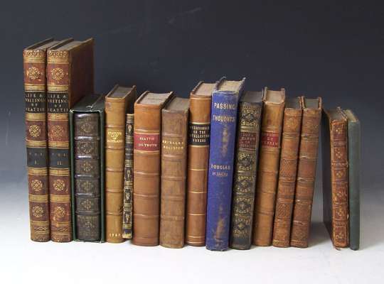An account of the life and writings of James Beattie. Edinburgh, 1806. 4to, 2 volumes, frontispiece, contemporary tree calf gilt, black labels, hinges cracking, extensive offsetting to title of volume I, bookplates; [Idem] An essay on the nature and immutability of truth. London, 1772. Third edition, 8vo, contemporary calf, rebacked, contemporary ink inscription on front endpaper; Conybeare, John A defence of reveal'd religion. London, 1732. 8vo, half title, contemporary panelled calf, rebacked, calf replaced on upper board; Abercrombie, John Inquiries concerning the intellectual powers and the investigation of truth. Edinburgh, 1830. 8vo, later half calf gilt; Meikle, James Metaphysical maxims. Edinburgh, 1811. Second edition, 8vo, contemporary morocco gilt, rubbed at edges; Cigogne, Daniel de L'office de la semaine sainte selon le messel... Lyon, 1699. 8vo, engraved title, engravings, woodcut head- and tail-pieces, contemporary calf gilt, lacking front and rear free endpaper; and 8 others (14)