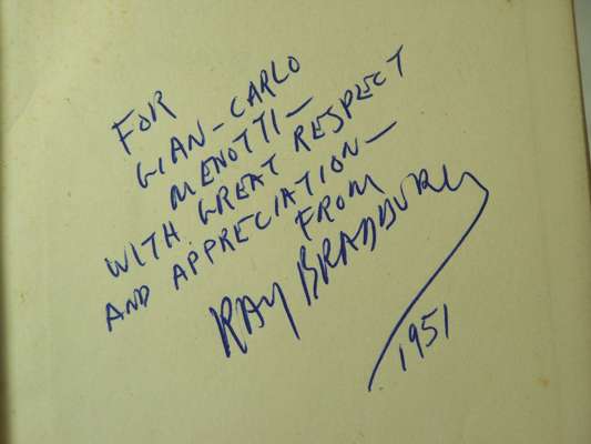 The silver locusts. London: Hart Davies, 1951. First edition, presentation copy inscribed "For Gian-Carlo Menotti with great respect and appreciation from Ray Bradbury, 1951", original cloth, dust-jacket, slightly rubbed at head of spine, lower wrapper slightly soiled, short closed tear to upper wrapper