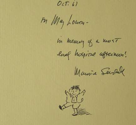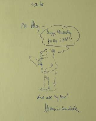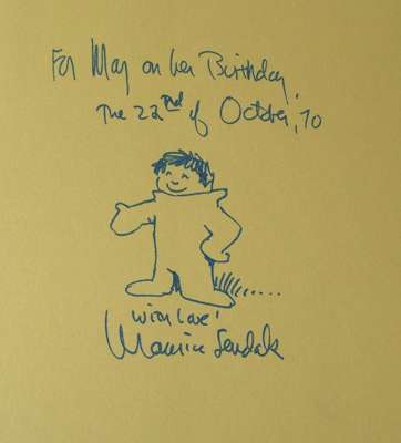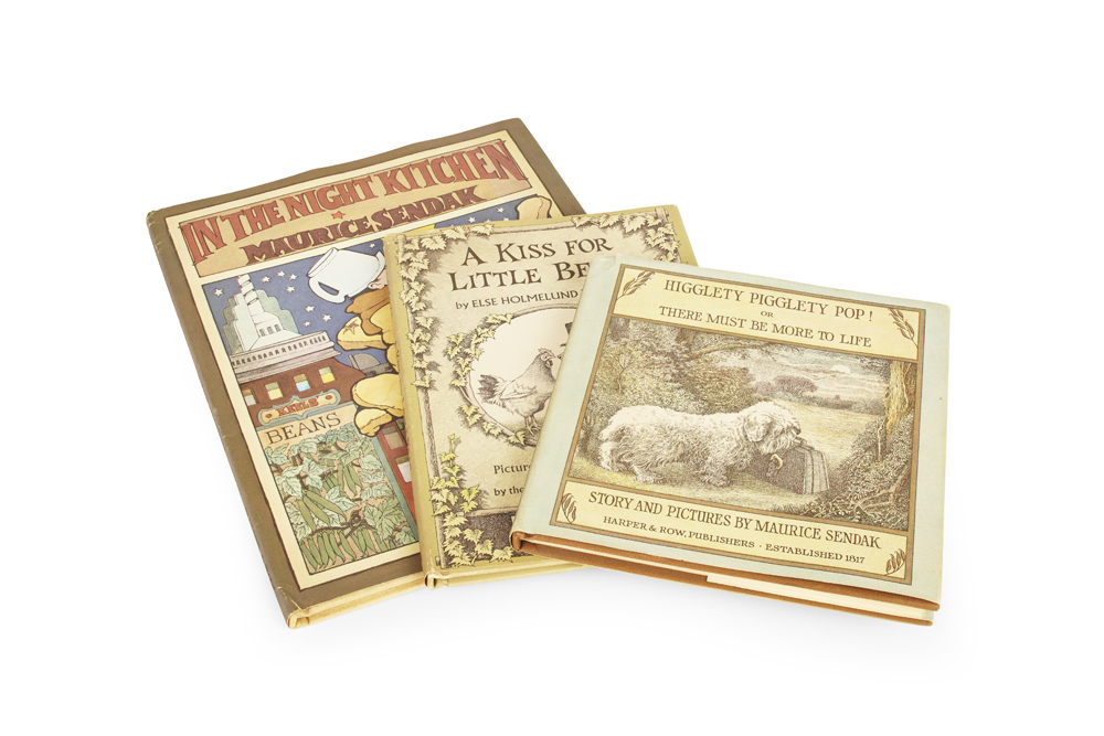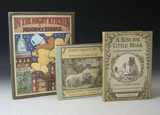 Higglety pigglety pop! New York: Harper & Row, 1967. First edition, 8vo, presentation copy inscribed by the author with sketch of a little boy ("Oct. '67 | For May Lowen - | in memory of a most | lovely hospital afternoon! | Maurice Sendak | [sketch of a little boy]") on front free endpaper, original cloth, dustwrapper ("$4.95" and "1067" on upper flap with five Sendak titles listed on lower flap), some minor fraying to extremities of dustwrapper; Minarik, E.H. A kiss for Little Bear. New York: Harper & Row, 1968. First edition (no ISBN or zip code on publisher's imprint page), 8vo, presentation copy inscribed by the artist with a sketch of Little Bear ("Oct. '68 | For May - | [sketch of Little Bear with speech bubble "Happy Birthday | for the 22nd!!"] | and all my love! | Maurice Sendak") on front free endpaper, original illustrated boards, dustwrapper ("$2.50 | Ages 4-8" on upper flap with four little bear books listed on lower flap), slightly bumped at head of spine; Sendak, M. In the night kitchen. New York: Harper & Row, 1970. First edition, 4to, presentation copy inscribed by the author with sketch of Mickey ("For May on her Birthday, | the 22nd of October, 70 | [sketch of Mickey] | With love, | Maurice Sendak") on front free endpaper, original cloth, dustwrapper ("$4.95" and "1070" on upper flap with seven Sendak titles listed on lower flap), head of spine slightly bumped, minor browning to dustwrapper (3)