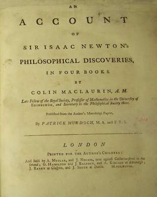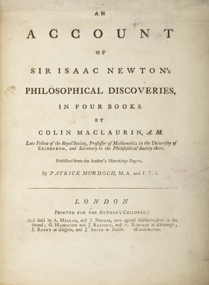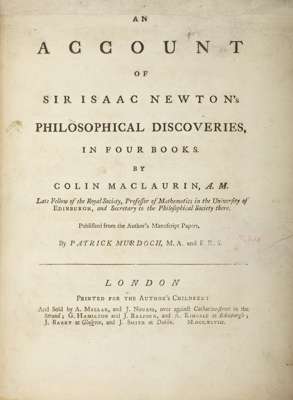 An account of Sir Isaac Newton's philosophical discoveries. London: printed for the author's children, sold by A. Millar, J. Nourse, 1748. First edition, 4to, lacking half-title, list of subscribers, 6 folding engraved plates, modern calf-backed boards, title page repaired along upper edge, some foxing and light water staining