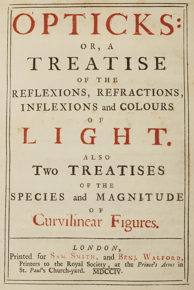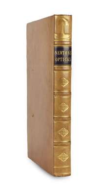 Opticks: or, a treatise of the reflexions, refractions, inflexions and colours of light. Also two treatises of the species and magnitude of curvilinear figures. London: printed for Sam. Smith and Benj. Walford, 1704. First edition, 4to (231 x 179mm.), [4], 144, 211, [1], 19 engraved plates, 2 folding, title printed in red and black, late19th century or early twentieth century calf gilt, black label, Northern Light Board gilt stamp at head of spine, some light spotting, 10 plates trimmed touching image or plate numeral, very slightly rubbed at foot of spine