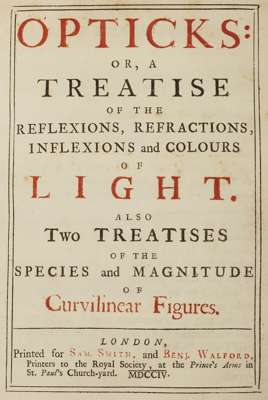 First edition of Newton's fundamental experiments on the color spectrum. This classic work also explains such optical phenomena as the rainbow, "Newton's rings", and the double refraction of the Icelandic spar. Newton opens his study with the sentence: "My design in this book is not to explain properties of light by hypotheses, but to propose and prove them by reason and experiments." Because of Newton's reliance on scientific method, Opticks remained for over a century a work of great authority.