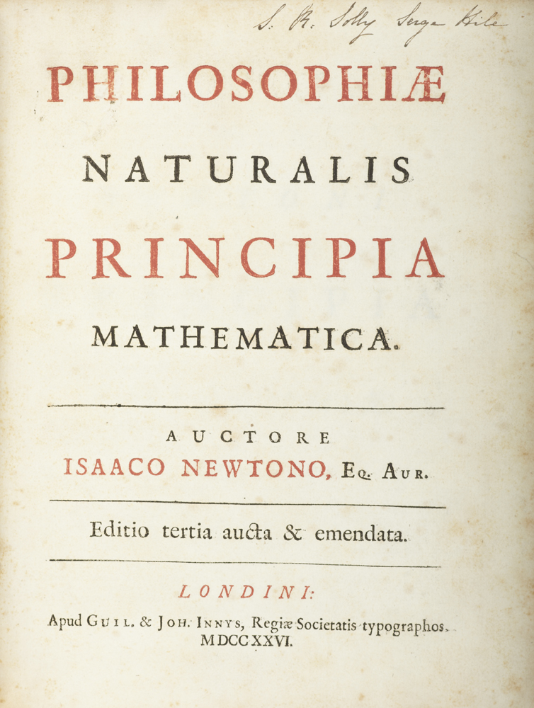 Philosophiae naturalis principia mathematica. London: William & John Innys, 1726. "Third" edition, 4to, lacking portrait, title in red and black, with half-title following title, Halley’s verses, engraved illustration of cometary orbit on p.506, woodcut diagrams throughout, two pages of publisher's adverts at rear, contemporary calf, neatly rebacked and repaired at corners, previous ink inscriptions to head of title and on front fixed endpaper, bookplate, some light foxing to title
