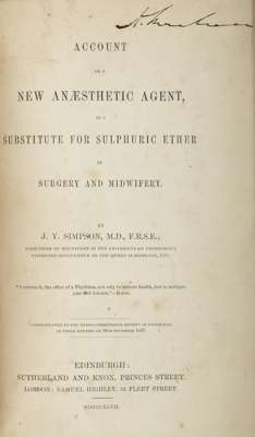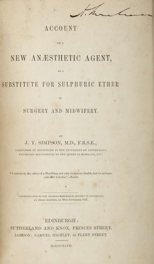 Account of a new anaesthetic agent as a substitute for sulphuric ether in surgery and midwifery. Edinburgh: Sutherland and Knox, 1847. Second issue, 8vo, 23pp., pages 18-23 postscript dated "Edinburgh, 15th November 1847," contemporary ink inscription to head of title [Fulton & Stanton VI 1]; [Idem] Remarks on the superinduction of anaesthesia in natural and morbid parturition. Edinburgh, 1847. 8vo, 24pp., contemporary ink inscription to title [Fulton & Stanton VI 5]; [Idem] Answer to the religious objections advanced against the employment of anaesthetic agents in midwifery and surgery. Edinburgh, 1847. 8vo, 23pp., contemporary ink inscription to title, some spotting and thumb marking [Fulton & Stanton VI ?]; bound with 15 other pamphlets [list available] in a 19th century blue cloth binding