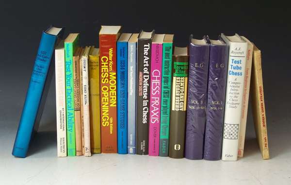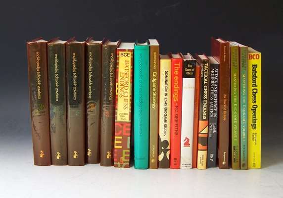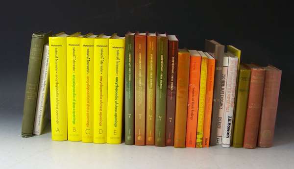 A collection of books on chess, to include Hoffer, L. Chess. London, [no date]. Sixteenth edition, 8vo, original cloth; Lee, F.J. and Gossip, G.H.D. The complete chess guide. Edinburgh, 1914. 8vo, original cloth; Matanovic, A. Encyclopaedia of chess openings. London, 1979. 8vo, 5 volumes, dustwrappers; Averbakh, Y. Comprehensive chess endings. Oxford, 1985. First English edition, 8vo, 5 volumes, original covers; Staunton, Howard The chess-player's handbook. London, 1890. 8vo, original cloth gilt; Cook, William The chess player's compendium. London, 1910. Fifth edition, 8vo, original cloth gilt; Rice, John M., et al. The two-move chess problem: tradition and development. London, 1966. 8vo, dustwrapper; and a quantity of others on chess, mainly modern. 8vo, including 6 volumes of the British chess magazine (84)