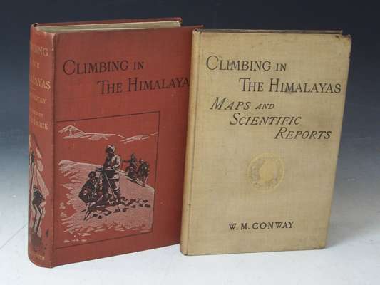 Climbing and exploration in the Karakoram-Himalayas. London: T. Fisher Unwin, 1894. 8vo, 2 volumes [including supplement], frontispiece, 3 folding maps, portrait, plates, original decorative cloth gilt, half-title repaired, previous ink inscription on front free endpaper, some light foxing (2)