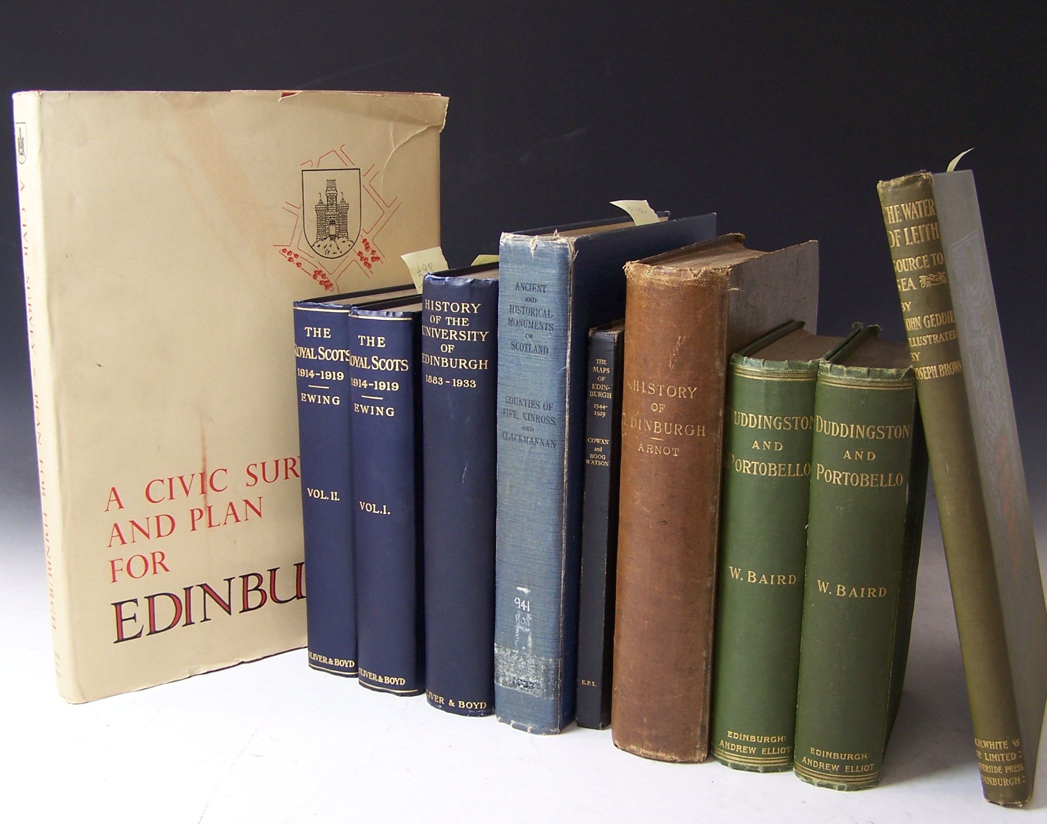 A civic survey & plan for the City & Royal Burgh of Edinburgh. Edinburgh, 1949. First edition, 4to, original cloth, dustwrapper, some marking to wrappers; Geddie, John The water of Leith. Edinburgh, 1896. 4to, illustrated by Joseph Brown, original green cloth gilt, some rubbing to edges; Baird, William Annals of Duddingston and Portobello. Edinburgh, 1900. 8vo, 2 volumes, original green cloth gilt, inner hinges weak; Arnot, Hugo The history of Edinburgh. Edinburgh, 1779. 4to, frontispiece, lacking folding map, modern cloth gilt, browning and foxing; Ewing, Major John The Royal Scots 1914-1919. Edinburgh, 1925. 8vo, 2 volumes, frontispiece, plates, original blue cloth gilt; Turner, A. Logan History of the University of Edinburgh 1883-1933. Edinburgh, 1933. 8vo, original blue cloth gilt; RCAHMS Counties of Fife, Kinross and Clackmannan. Edinburgh, 1933. 4to, original blue cloth, rubbed, ex-library copy; Watson, C. B. & Cowan, W. The maps of Edinburgh 1544-1929. Edinburgh, 1932. 8vo, presentation copy from editor Boog Watson, cloth backed boards; Groome, Francis H. Ordnance gazetteer of Scotland. Edinburgh, 1886. 8vo, 6 volumes, original cloth gilt, water staining to boards and some interior pages; and 39 others (55)