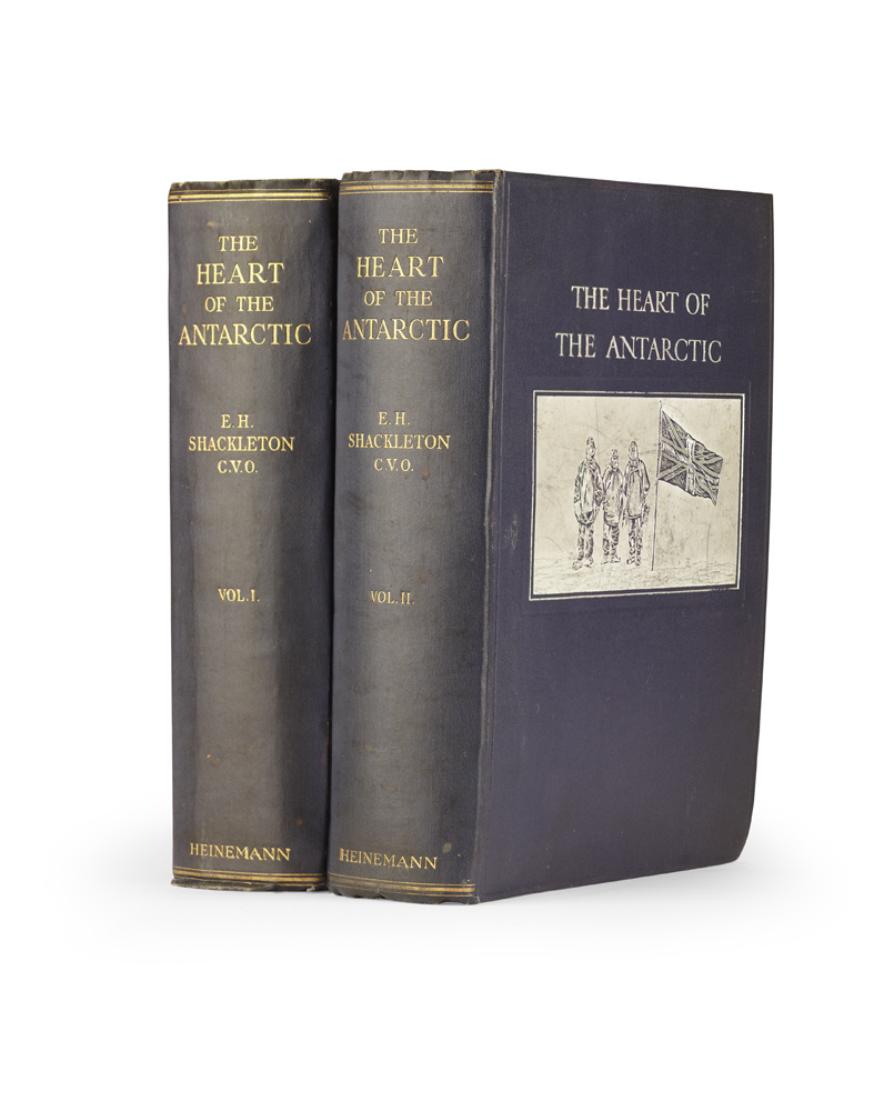 The heart of the Antarctic. London: William Heinemann, 1909. 8vo, 2 volumes, 4 folding maps [in pocket at rear], 6 plates, original blue cloth, silvered stamp to upper boards, some rubbing to edges (2)